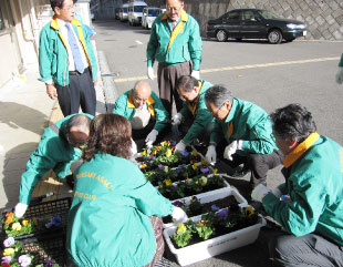 メンバーは、寄贈するパンジーのプランターへの植え込み作業を終えた後、別室にて、この施設を紹介するビデオを見るとともに、施設長で医師でもある江川文誠氏と懇談。贈呈式に臨みました。
