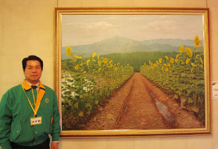 この絵画は、施設のイメージである「ひまわり」を題材に背景に大山、丹沢連峰、中央に「路」、左右に茶畑と川を配したもので、100号という大きなカンバスに描かれたもので、「ひまわりの路」と命名されました。